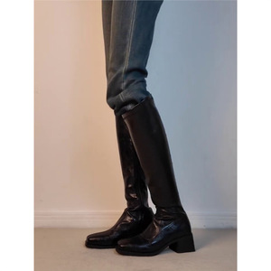 羊皮版~欧美风黑色侧拉链高筒骑士靴女真皮复古方头粗跟瘦瘦长靴