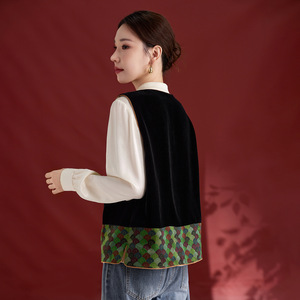 真丝丝绒马甲复古新中式原创设计拼接撞色百搭香云纱马甲女1737