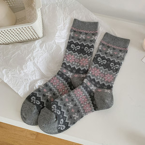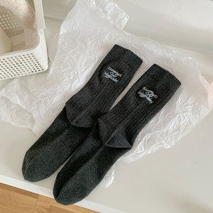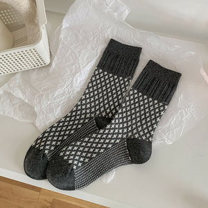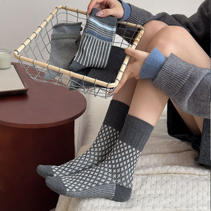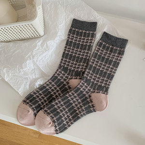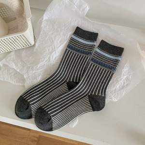 灰色袜子女中筒袜秋冬季miu竖条格纹双针棉长袜可爱蝴蝶结堆堆袜