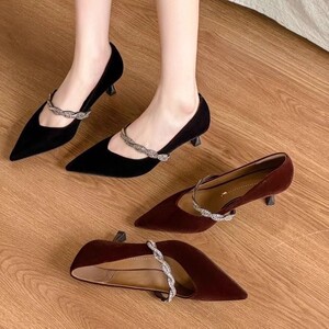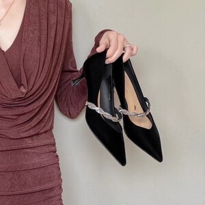 一代佳人26W2310细跟高跟一字扣带水钻尖头浅口绒面秋新款单鞋路