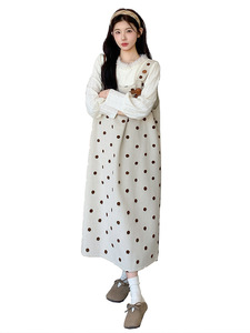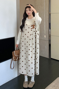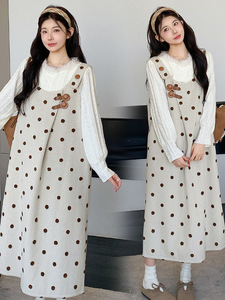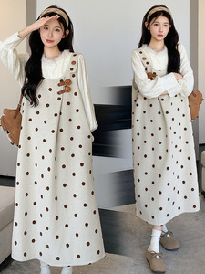 孕妇装2025新款秋冬蕾丝长袖打底上衣复古波点毛呢遮肚背心裙套装