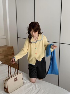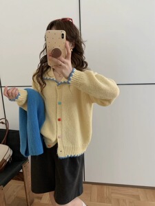 韩系拼色娃娃领彩扣针织开衫女2025秋冬新款宽松百搭软糯毛衣外套