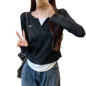 实拍260G绵羊绒长袖t恤女2025初秋薄款修身假两件打底衫圆领上衣