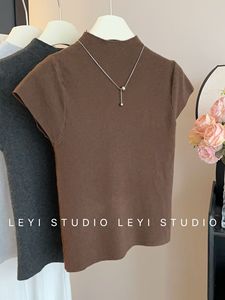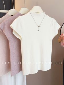 新款纯色半高领针织衫正肩短袖女早秋新款修身显瘦小飞袖气质上衣