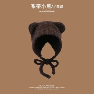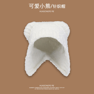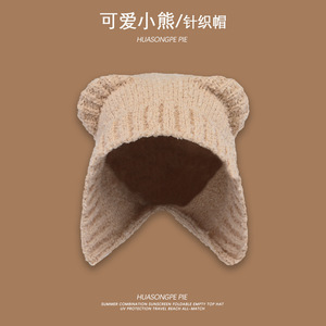 新款秋冬日韩系带百搭针织帽可爱小熊保暖帽女孩显脸小护耳毛线帽
