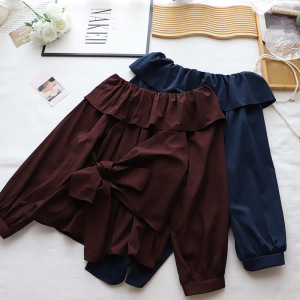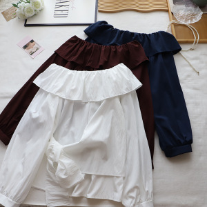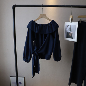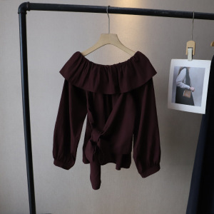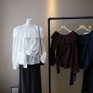 [比正]2025秋季新款韩版一字肩荷叶边系带收腰显瘦长袖衬衫女4802