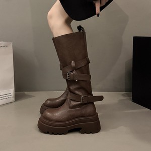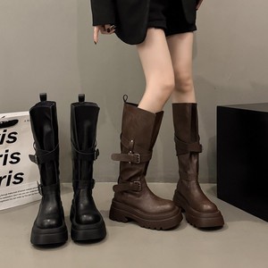 月屿百搭复古皮带扣机车靴2025秋季新款女小个子厚底增高骑士靴子