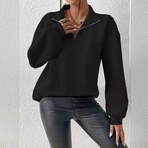 2025欧美秋季爆款舒适宽松华夫格纯色立领拉链长袖拼接女装卫衣