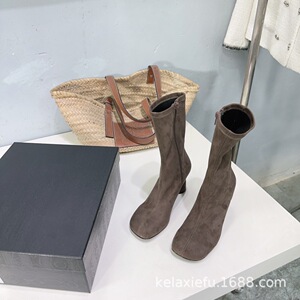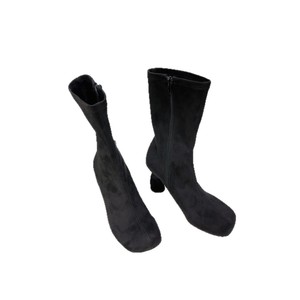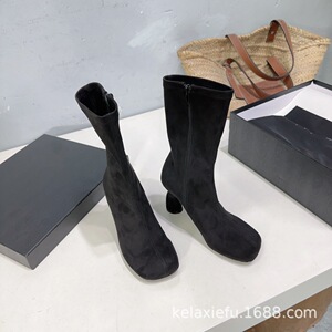 高定2025秋冬真皮圆头复古香蕉跟高跟侧拉链弹力瘦瘦靴时装单靴女