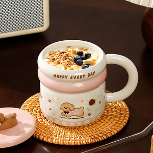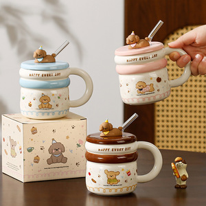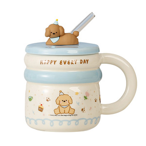 围兜狗狗可爱马克杯情侣高颜值带盖吸管陶瓷杯子家用喝水礼品水杯