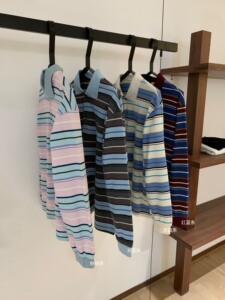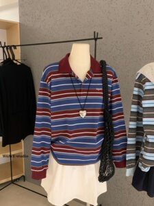 WGWE6796#韩国小众美式复古撞色条纹polo领字母刺绣翻领长袖T恤女