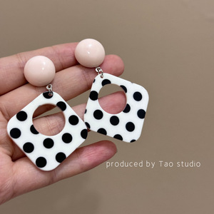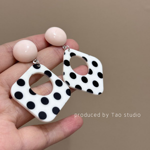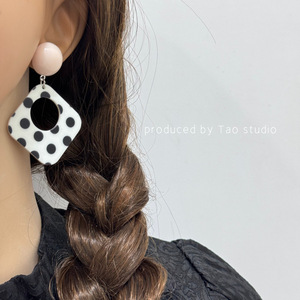黑白波点镂空圆角菱形怀旧时髦80年代夸张复古港风耳饰耳夹无耳洞