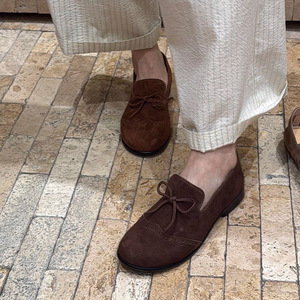 牛皮版~韩版真皮圆头平底小皮鞋女复古麂皮蝴蝶结布洛克单鞋女潮