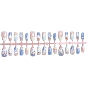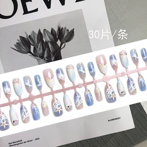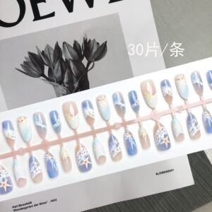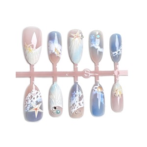 跨境欧美热销蓝色度假风穿戴甲3D大海带钻立体批发美甲贴片短杏仁
