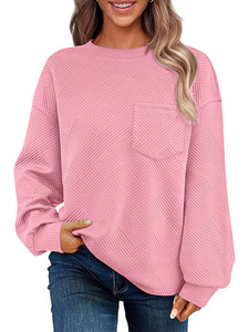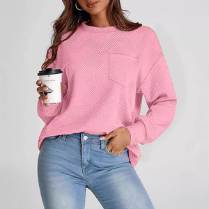 女式针织提花长袖圆领胸前口袋运动衫休闲宽松套头衫卫衣