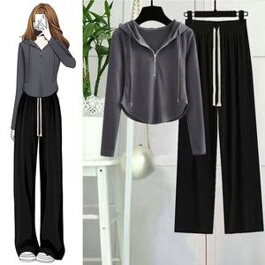 单套装女早秋新款韩版设计感拉链弧度连帽卫衣高腰阔腿裤两件套潮