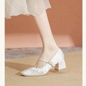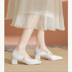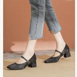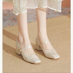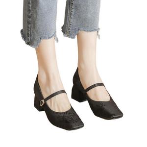 国风中式单鞋女配裙子粗跟绸缎新款刺绣一字方头浅口玛丽珍鞋高跟