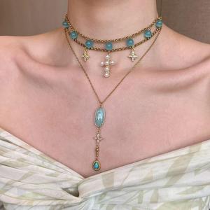 原创蓝猫眼天河石芒星十字架钛钢项链叠戴辣妹