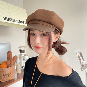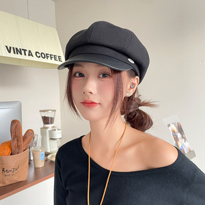 韩版金属标大头围八角帽子女秋冬显脸小鸭舌贝雷帽百搭报童画家帽