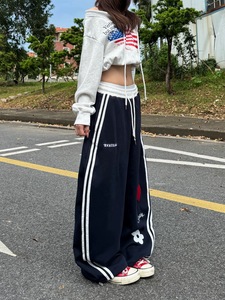 ME KAKAMEE十三行秋美式爱心字母刺绣阔腿撞色弯刀休闲裤女 A2813