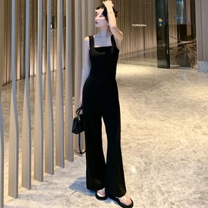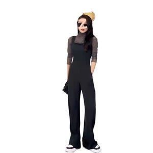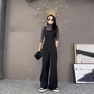 2025春秋吊带连体裤女高腰显瘦套装一字肩小个子黑色背带阔腿裤女