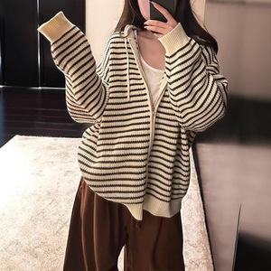 杏色抽绳连帽条纹针织开衫女2025新秋季韩版宽松百搭上衣外套
