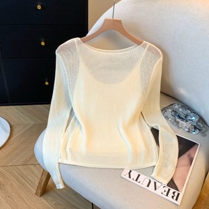 广州十三行高货爆款~短款针织衫女秋吊带镂空防晒罩衫上衣两件套