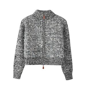 花灰色重工亮片中高领短款针织开衫女2025年秋季新款复古洋气上衣