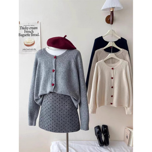 纯色简约甜美爱心扣圆领毛衣外套女秋冬新款气质减龄外搭短款毛衣