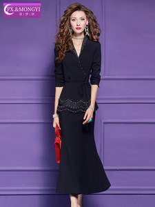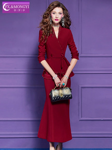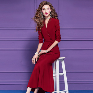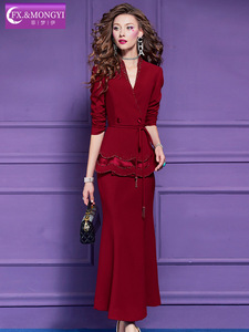 菲梦伊钉珠红色职业套装女秋季轻熟气质荷叶边西装上衣鱼尾半身裙