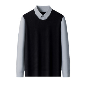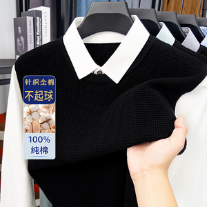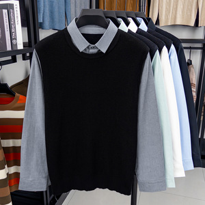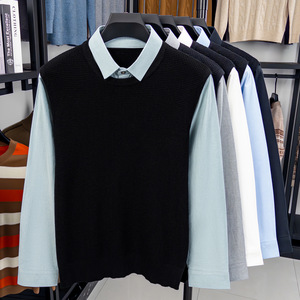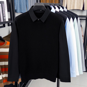 抗起球针织假两件2025秋季新款商务休闲拼接衬衫领长袖打底毛衣男