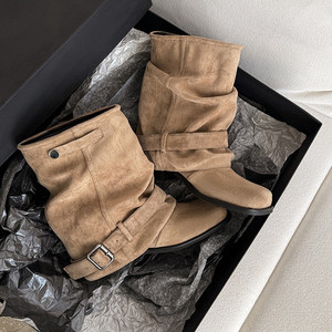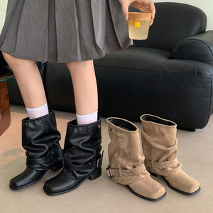 皮带扣裤管靴女宽筒单靴子秋冬新款方头粗中跟套筒甜酷风短靴女靴