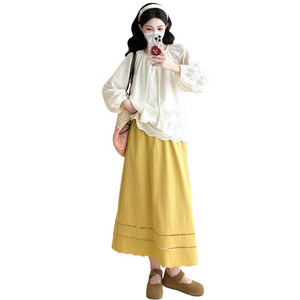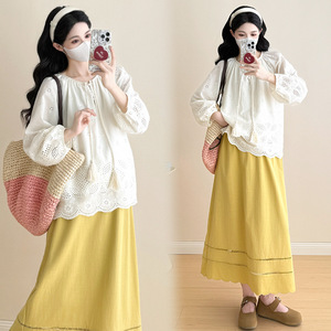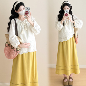 孕妇秋季新款法式钩花镂空系带衬衫花瓣边时尚半身裙甜美显瘦套装