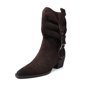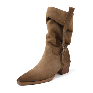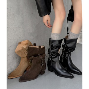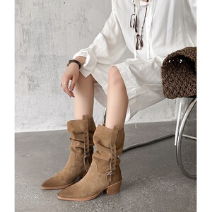 zijin家~英姿飒爽复古风尖头褶皱堆堆靴2025秋冬新款时尚中筒靴女