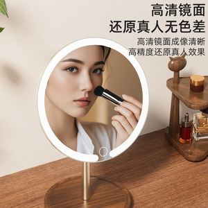LED化妆镜带灯台式纯木底座合金杆三色灯光补光镜化妆梳妆镜子