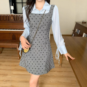 大码2025秋季微胖大码波点长袖背心裙拼接衬衫假两件连衣裙女