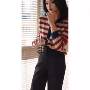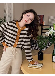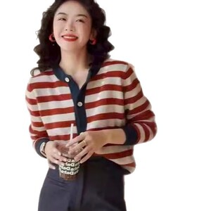 秋冬复古圆领条纹撞色羊毛针织开衫女上衣韩版毛衣羊绒打底法式