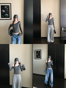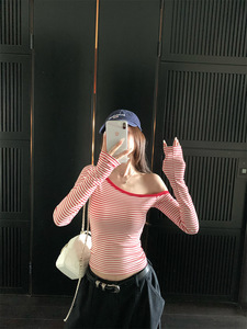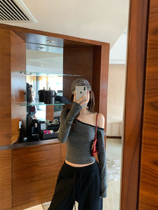 Skk Store 淡颜女友 面膜级清凉透气仿天丝条纹斜肩长袖T恤打底衫