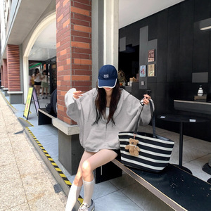 2025法式秋季宽松显瘦休闲上衣慵懒风纯色气质拉链连帽长袖卫衣女