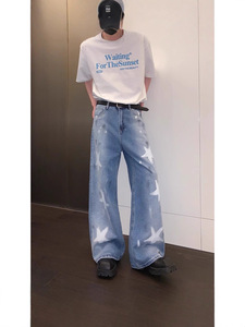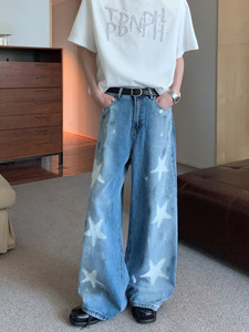 涂鸦五角星牛仔裤男直筒宽松阔腿美式高街裤子潮牌痞帅设计感长裤