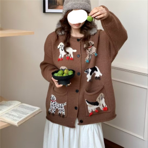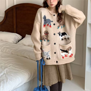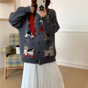 韩版趣味卡通灰色圆领毛衣外套女秋冬新款宽松慵懒风针织开衫女潮