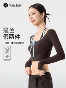 假两件挂脖长袖瑜伽服女固定杯短款运动上衣撞色包边百搭健身上衣