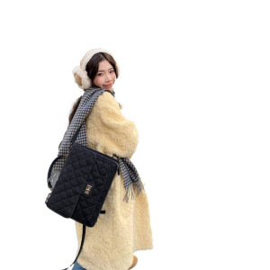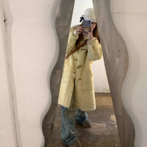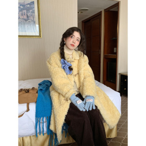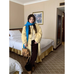 羊羔毛上衣中长款毛毛外套女韩系秋冬软糯皮撞色牛角扣大衣