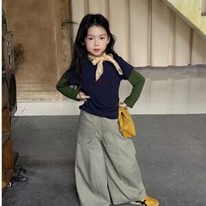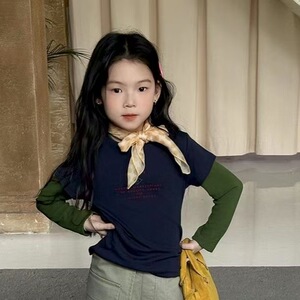 2025秋季新款女童韩版真两件长袖T恤女宝宝时髦圆领上衣裤子