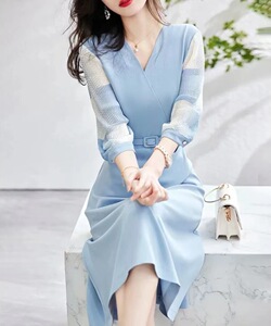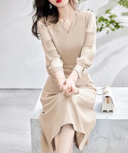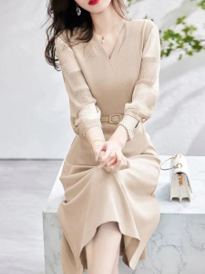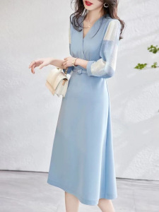 印花压皱拼接裙子女2025秋新款优雅气质V领收腰七分袖长款连衣裙