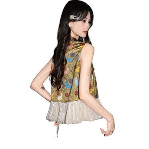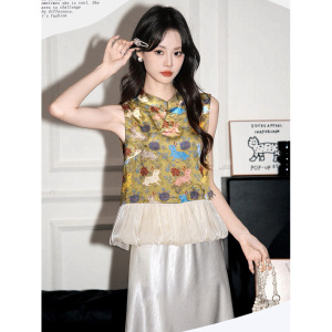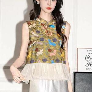 【672】新中式国风盘扣刺绣无袖背心衬衫女夏季外穿上衣绿色