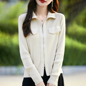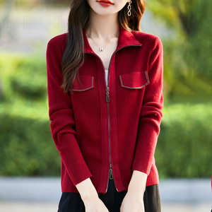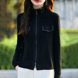 2025年早秋新款精纺羊毛立领针织开衫长袖女双拉链假口袋镶钻外套