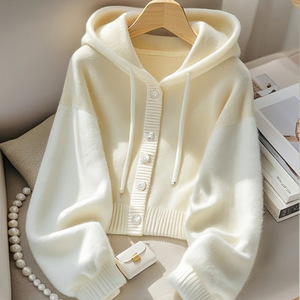 白色宽松连帽针织衫软糯毛衣女2025秋冬季新款慵懒风减龄洋气上衣