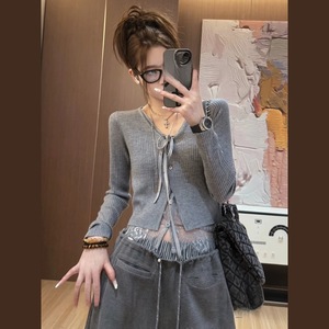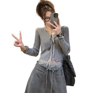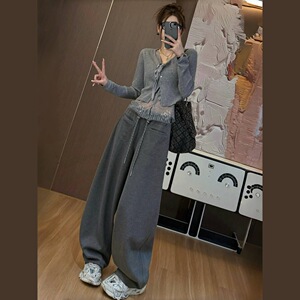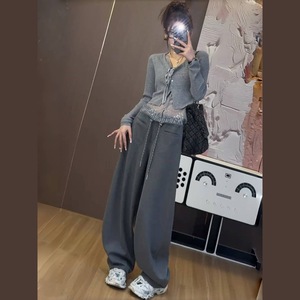 2025春夏新款时尚休闲减龄套装假两件蕾丝拼接针织衫阔腿裤两件套