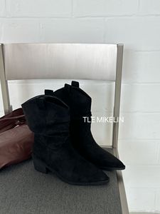 轻奢小众复古2025秋冬新款尖头粗跟短筒女靴外贸跨境